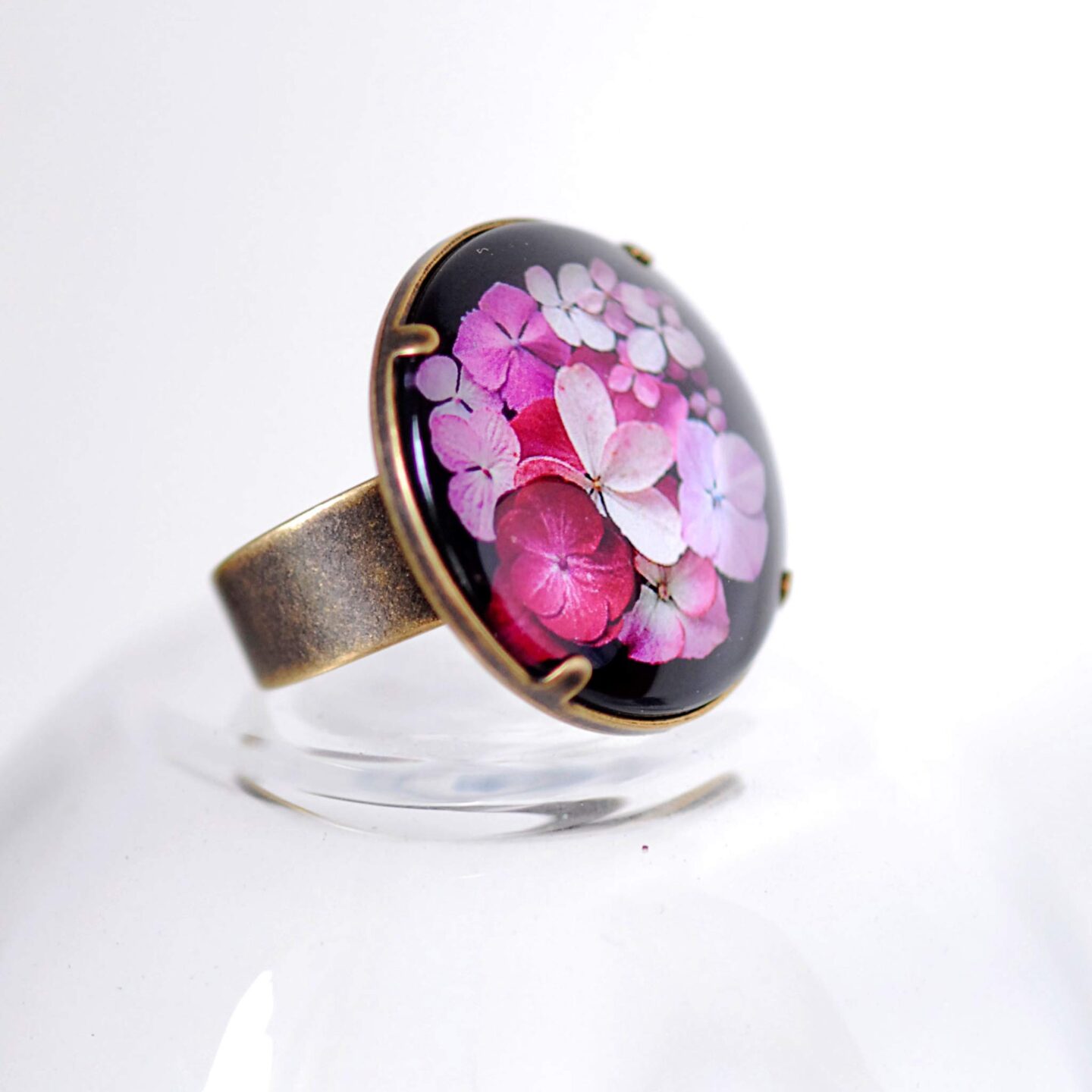 La bague est composée d’une photographie, d’un cabochon en verre (25 mm de diamètre) et d’un corps de bague en laiton patiné couleur bronze réglable.