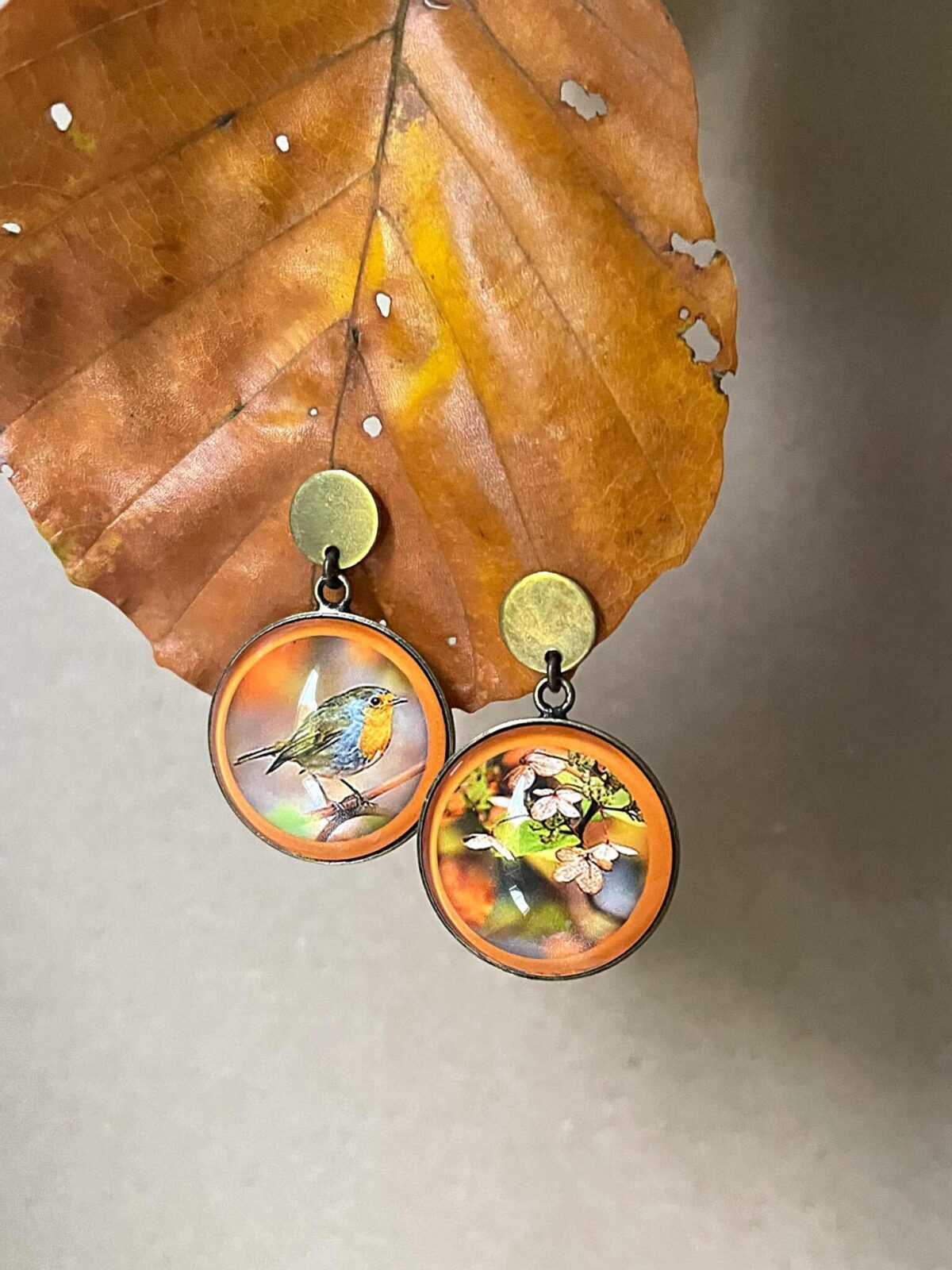 Ces boucles d’oreilles sont composées de photographies personnelles, de cabochons en verre ronds de 2 cm de diamètre et de sertis en laiton patiné, couleur bronze.